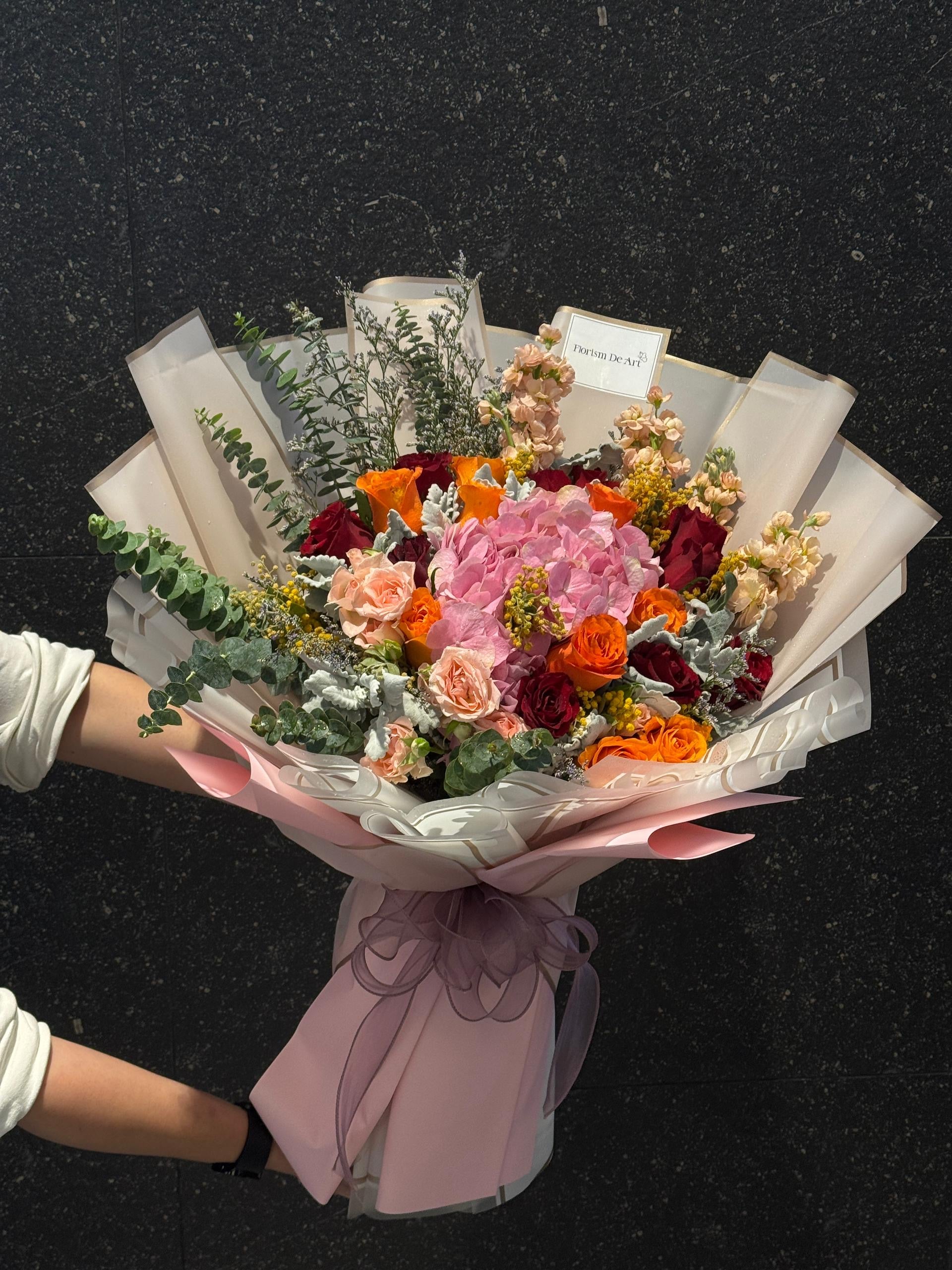 A radiant blend of warmth and romance, Blushing Sunset captures the fleeting beauty of golden hour in full bloom. Soft blush pinks meet vibrant sunset oranges and deep crimson tones, creating a bouquet that feels both dreamy and alive. Delicate hydrangeas, elegant roses, and textured greenery come together in perfect harmony—like the sky painted at dusk.