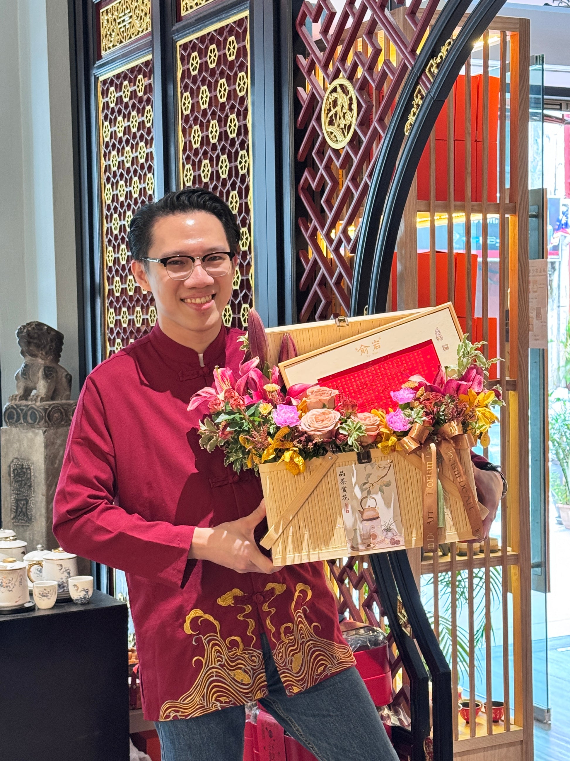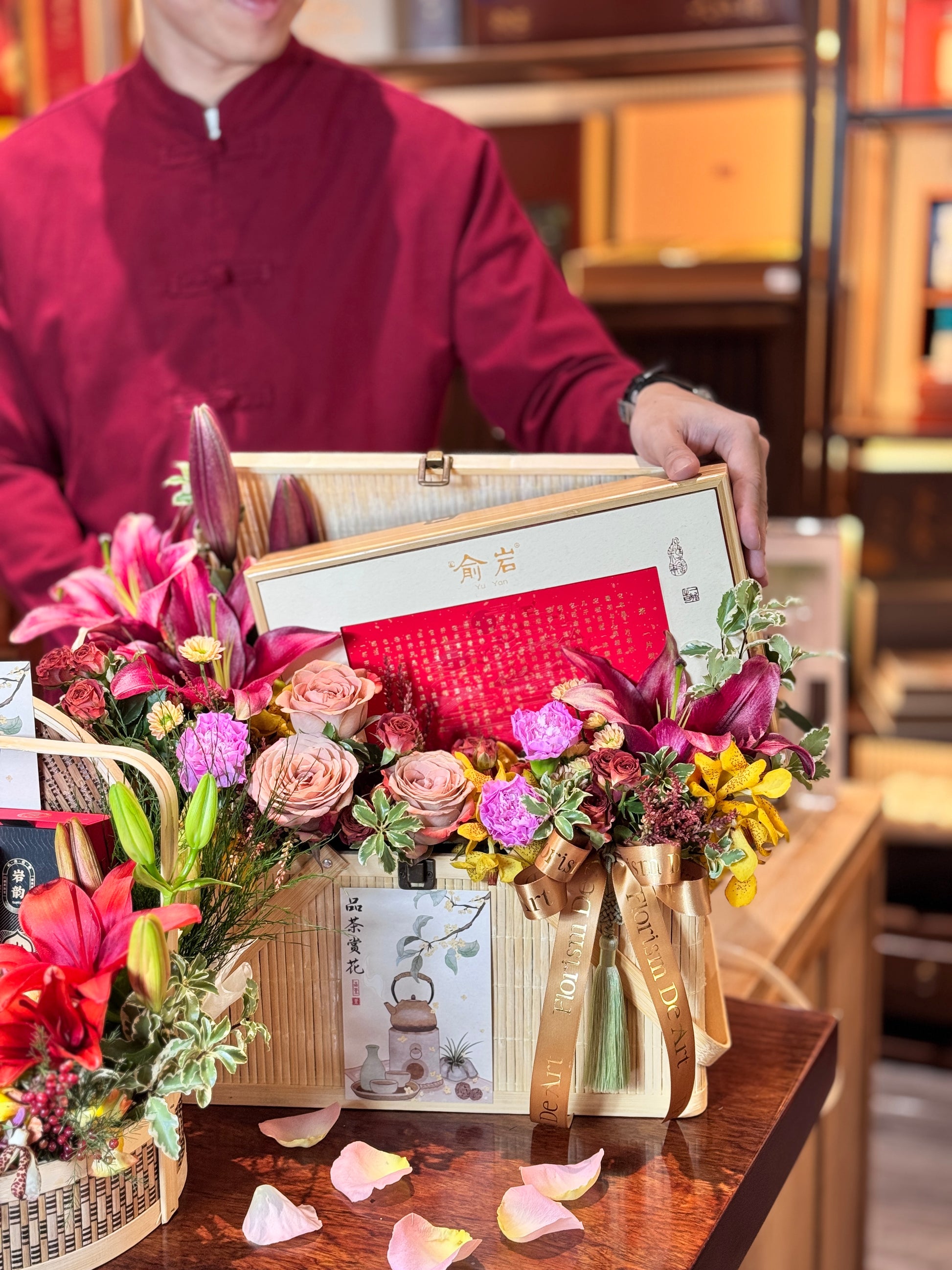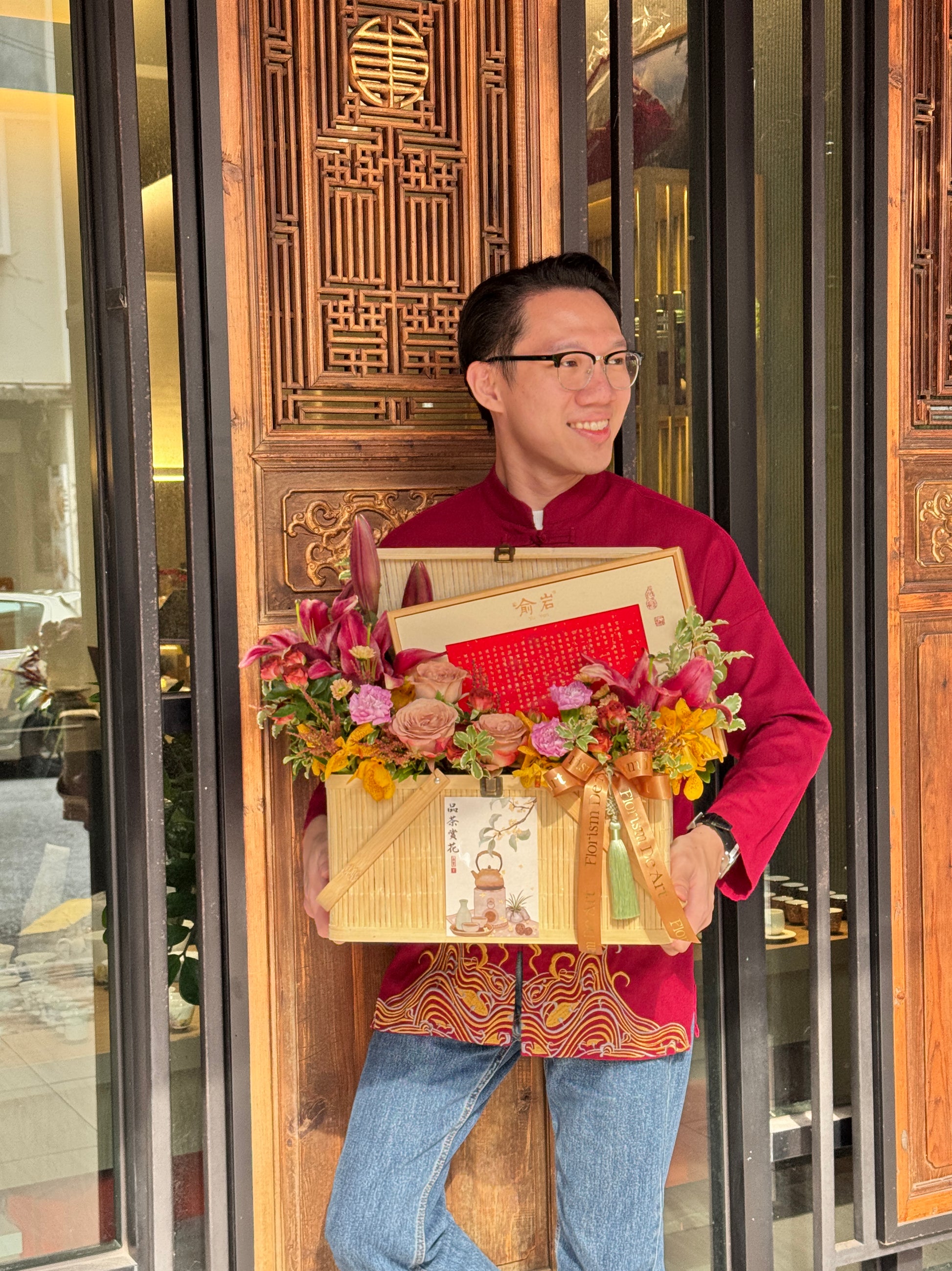 Featuring bold red lilies, rose, carnation, mum, and incense-inspired packaging, this piece celebrates festive energy, warmth, and enduring blessings.