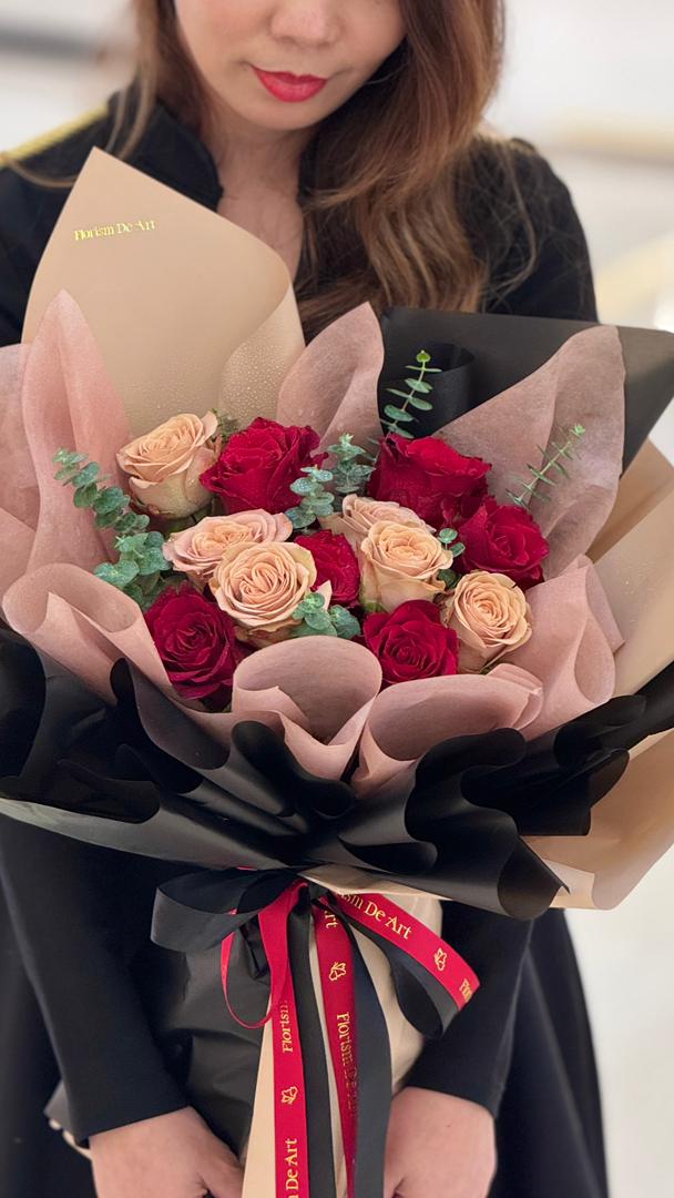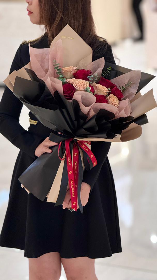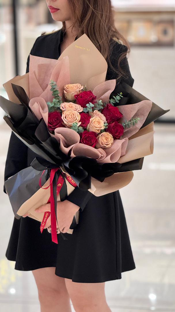 Bold yet tender, Crimson Promise is a Valentine’s Day bouquet that speaks the language of devotion and desire. Featuring rich crimson red roses paired with soft blush roses, this arrangement captures the balance between passion and romance. Accented with fresh eucalyptus and wrapped in elegant layers of black and nude-toned paper, it delivers a modern, sophisticated expression of love.