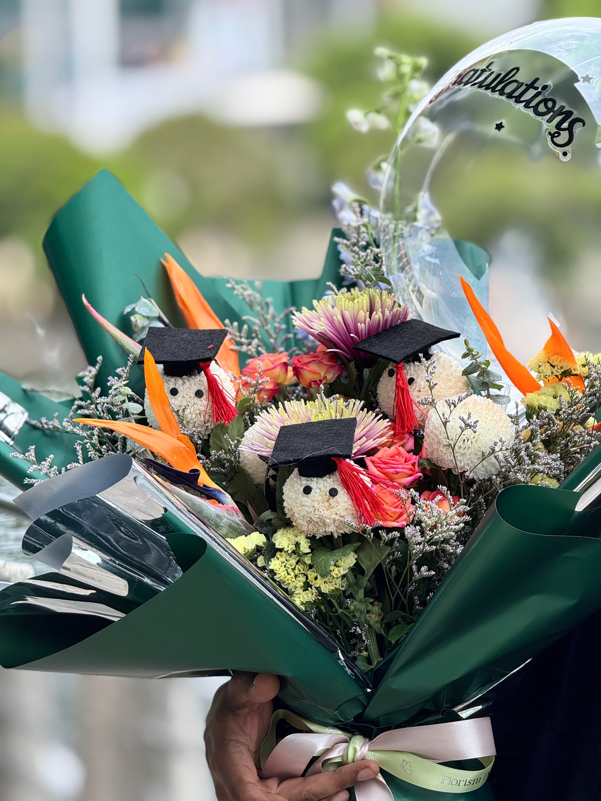 Celebrate academic achievements with a burst of color and charm! Grad Blooms Delight is a unique bouquet handcrafted with vibrant blooms, lush greenery, and adorable plush-inspired floral figures donning mini graduation caps. Topped with a clear congratulatory balloon, this arrangement is the perfect gift to honor a graduate’s big day with flair, fun, and heartfelt congratulations.