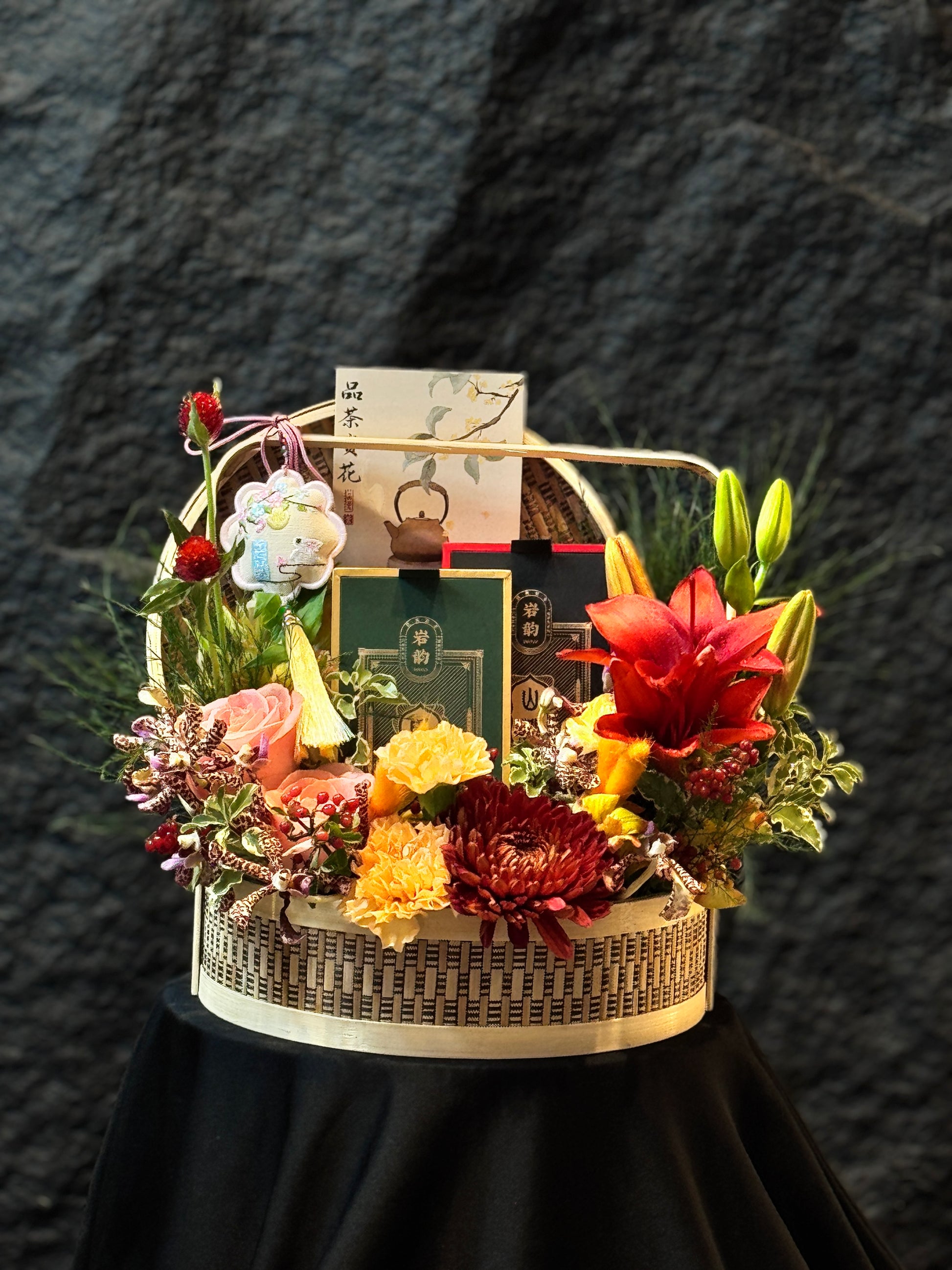 This arrangement radiates oriental elegance with its bamboo box, warm-toned floral composition, calligraphy scroll, and a tea-themed card.